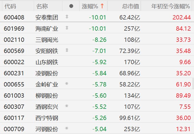 格隆汇11月18日|A股市场钢铁股集体下跌,其中,安泰集团、海南矿业10CM跌停,三钢闽光跌超8%,安阳钢铁跌7%,山东钢铁、凌钢股份、金岭矿业、柳钢股份、酒钢宏兴、西宁特钢、河钢股份跌超5%。