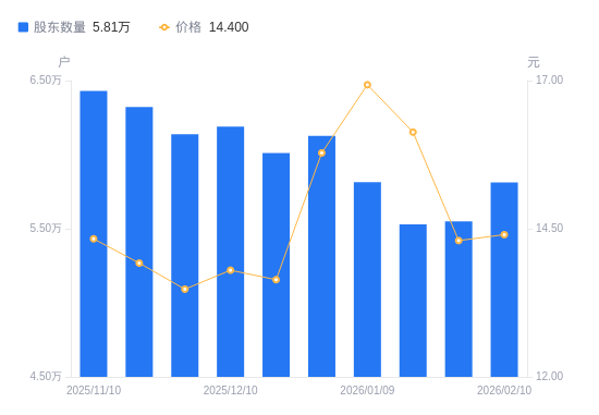 近一年(2025年2月28日至2026年2月10日),湘电股份A股股东户数从4.95万户,增加至5.81万户,增幅17.35%,区间股价上涨34.20%。