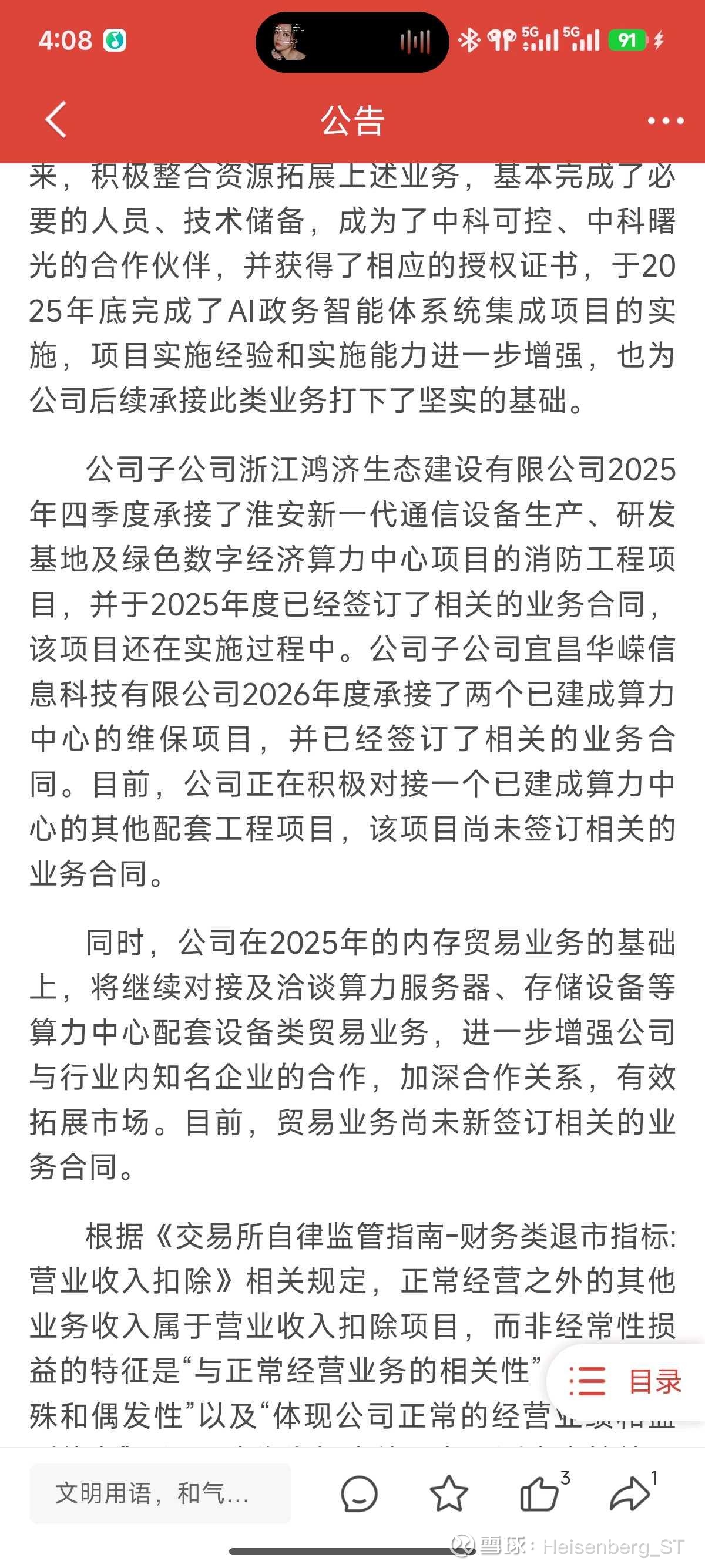 这两天看到很多人在讨论华嵘那3271万信息化收入到底该不该扣,我也认真研究了一圈公告、规则和项目情况,说点自己的看法——我个人是倾向于不应该扣除的。早在2026年2月份我也发过帖子“ST华嵘(600421):摘帽板上钉钉,积极从传统建筑相关行业向AI与信息技术服务转型”,有兴趣的小伙伴可以翻出来...