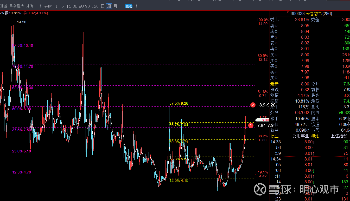先锋电子,还是熟悉的老朋友,一动就好加速的主~这里看一张周图:趋势,红白两条多空线对应13.3-13.18上看多,价格叠加百分比显示,53.75下跌的875位对应14,近循环的半分对应14.56,14-14.56构成当前价格关键区;能突破站到14.56上方,则波段有去19.25-19.68的预期。当前支撑14,短压14.56,突破...