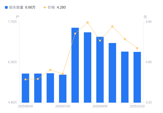 1月6日消息,数据显示,截至2025年8月31日,青松建化A股股东总户数为7.5万户,较上期(2025年7月20日)增加1.63万户,增幅27.77%。公司最新A股总股本为16.05亿股,其中流通A股13.79亿股,户均持有流通A股数量为1.84万股,较上期减少5104.89股,降幅21.73%;户均持流通A股市值8.4万元,较上期减少4538.34元,降幅5.13%。