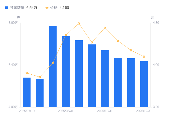 1月6日消息,数据显示,截至2025年7月31日,青松建化A股股东总户数为7.88万户,较上期(2025年7月20日)增加2.01万户,增幅34.24%。公司最新A股总股本为16.05亿股,其中流通A股13.79亿股,户均持有流通A股数量为1.75万股,较上期减少5991.42股,降幅25.51%;户均持流通A股市值7.07万元,较上期减少1.79万元,降幅20.17%。