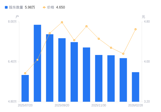 近一年(2025年2月28日至2026年2月28日),青松建化A股股东户数从5.9万户,增加至5.98万户,增幅1.44%,区间股价上涨27.75%。