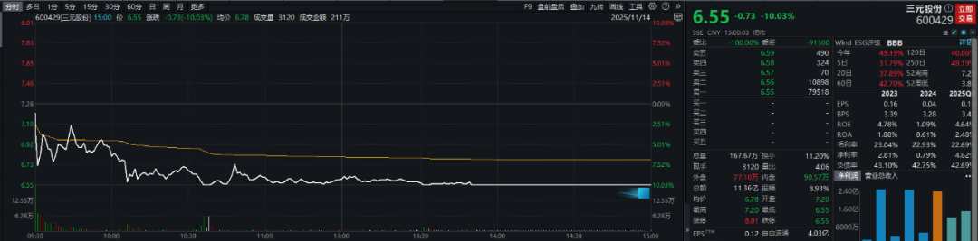 因奶皮子糖葫芦的火爆而斩获四连板的三元股份(600429)(600429),今日盘中持续低位震荡,午后被按死跌停,最终报收于6.55元/股,卖一位置积压近8万手卖单等待出逃。