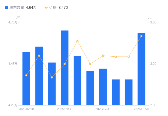 近一年(2025年2月28日至2026年1月20日),冠豪高新A股股东户数从4.52万户,增加至4.64万户,增幅2.56%,区间股价上涨9.46%。