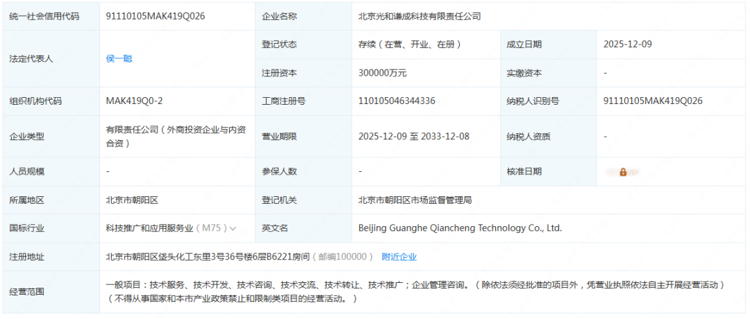 该公司法定代表人为侯一聪,注册资本300000万元。经营范围:一般项目:技术服务、技术开发、技术咨询、技术交流、技术转让、技术推广;企业管理咨询。(除依法须经批准的项目外,凭营业执照依法自主开展经营活动)(不得从事国家和本市产业政策禁止和限制类项目的经营活动。)