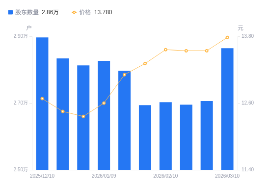 近一年(2024年12月31日至2025年12月31日),宁夏建材A股股东户数从2.89万户,减低至2.81万户,降幅2.74%,区间股价下跌15.86%。