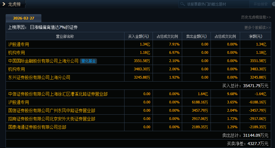 涪陵电力(600452)今日涨停,成交额16.93亿元,换手率8.49%,盘后龙虎榜数据显示,沪股通专用席位买入1.34亿元并卖出6188.16万元,2家机构专用席位净买入1.53亿元。中信证券上海徐汇区漕溪北路证券营业部净卖出1.64亿元。