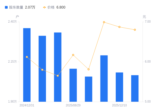 近一年(2024年12月31日至2025年12月19日),风神股份A股股东户数从2.36万户,减低至2.07万户,降幅12.46%,区间股价上涨8.80%。