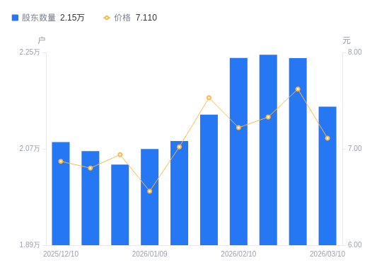 3月17日消息,数据显示,截至2026年1月30日,风神股份A股股东总户数为2.13万户,较上期(2026年1月20日)增加494户,增幅2.37%。公司最新A股总股本为7.29亿股,其中流通A股7.29亿股,户均持有流通A股数量为3.42万股,较上期减少810.04股,降幅2.31%;户均持流通A股市值25.74万元,较上期增加1.17万元,增幅4.78%。
