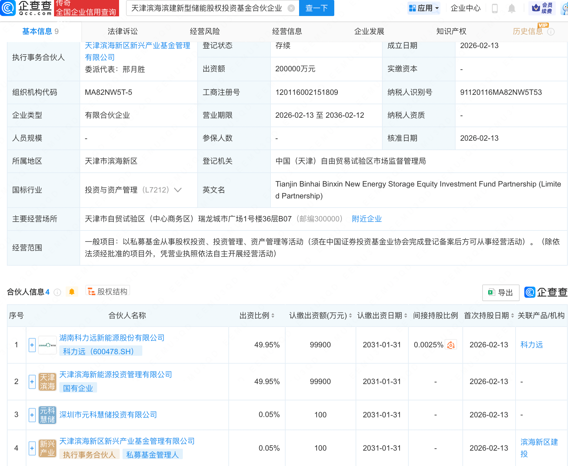 企查查APP显示,近日,天津滨海滨建新型储能股权投资基金合伙企业(有限合伙)成立,出资额20亿元,经营范围包含:以私募基金从事股权投资、投资管理、资产管理等活动。企查查股权穿透显示,该企业由科力远(600478)(600478.SH)等共同出资。