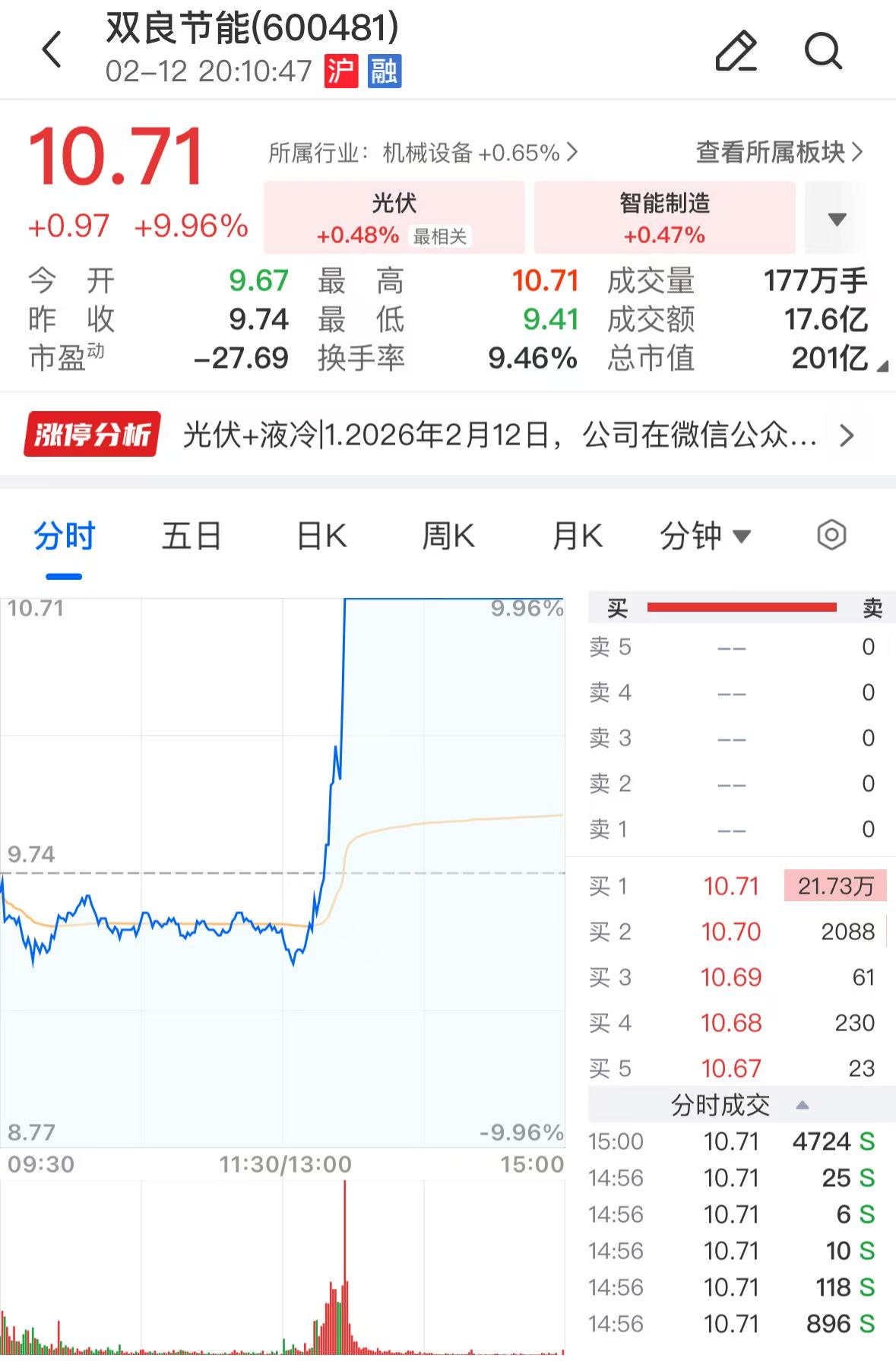 从二级市场表现来看,双良节能今日午后股价快速放量拉升后涨停,截至收盘,该股仍有超21万手买单封住涨停板,报收10.71元/股。