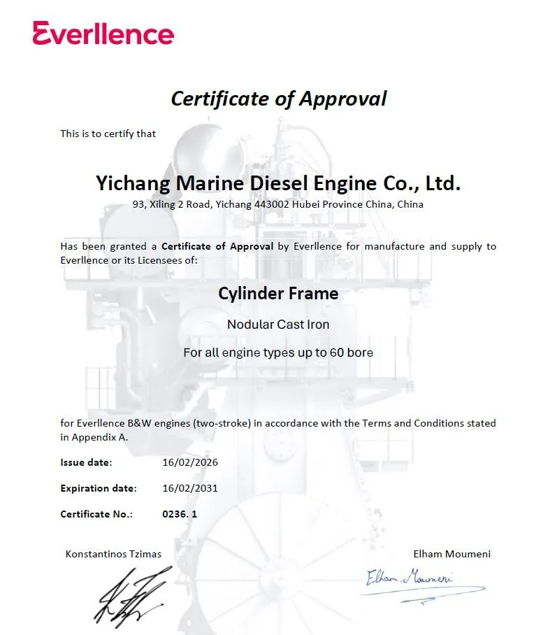 日前,中国动力(600482)下属中船宜柴公司收到Everllence专利公司颁发的600mm以下缸径球墨铸铁气缸体生产认可证书。至此,宜柴公司已取得船用低速机三大关重件——缸体、缸套、中间体的全部生产认可证书。