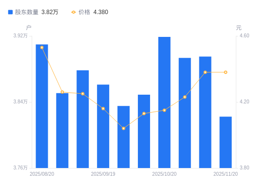 近一年(2024年11月20日至2025年11月20日),津药药业A股股东户数从4.26万户,减低至3.82万户,降幅10.28%,区间股价上涨2.77%。