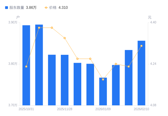 近一年(2025年2月10日至2026年2月10日),津药药业A股股东户数从4.07万户,减低至3.86万户,降幅5.29%,区间股价上涨2.81%。