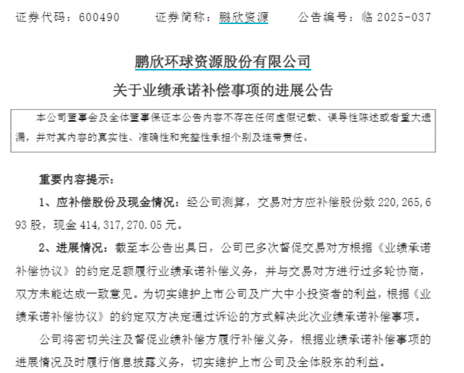 14日晚间,鹏欣资源(600490)(600490)公告称,经多轮协商未达成一致,公司于11月14日召开董事会,审议通过《关于通过诉讼化解未达成业绩承诺补偿争议的议案》,决定启动司法程序追偿。