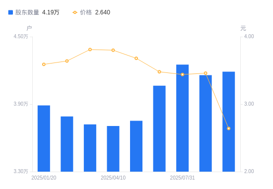 近一年(2024年12月31日至2025年12月31日),龙元建设A股股东户数从3.87万户,增加至4.19万户,增幅8.34%,区间股价下跌29.79%。