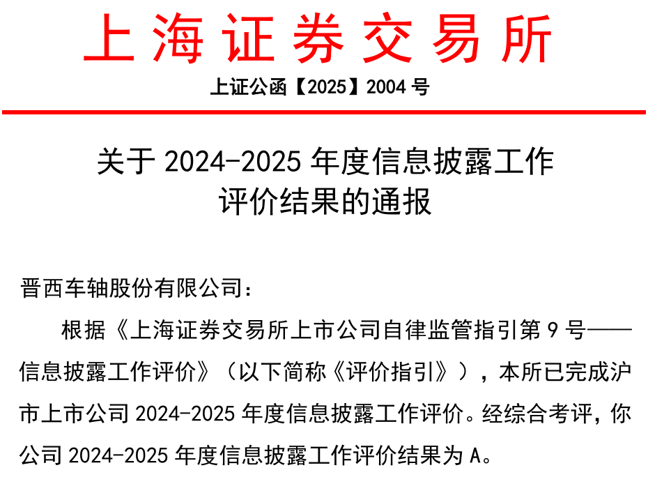 日前,上海证券交易所公布2024-2025年度沪市上市公司信息披露工作评价结果,晋西车轴(600495)凭借规范严谨的治理架构与精准高效的信息披露实践,成功获评最高等级A级。这一荣誉不仅是对公司在信息披露、公司治理、规范运作及投资者关系管理等领域工作的高度认可,更凸显了公司在资本市场中的优质形象。本次评价覆盖2263家沪市上市公司,获评A类比例为19%。