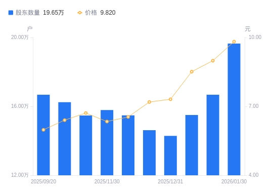 近一年(2025年2月28日至2026年1月30日),驰宏锌锗A股股东户数从17.18万户,增加至19.65万户,增幅14.40%,区间股价上涨85.60%。