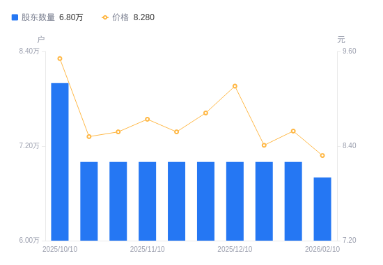 近一年(2025年3月31日至2026年2月10日),天富能源A股股东户数从7.39万户,减低至6.8万户,降幅8.02%,区间股价上涨25.36%。