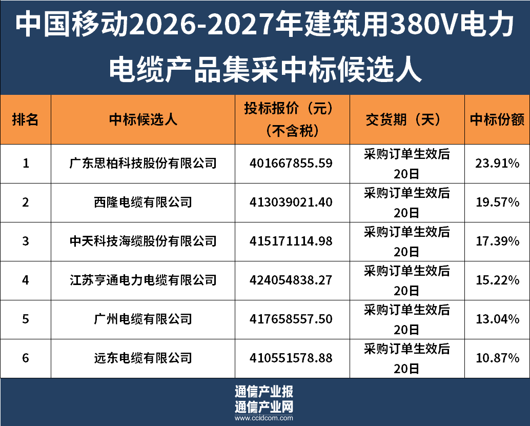 日前,中国移动(600941)公示2026年至2027年建筑用380V电力电缆产品集采中标候选人,中天科技(600522)、亨通电力电缆等六厂商中标。