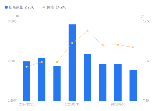 近一年(2024年12月31日至2025年11月20日),贵航股份A股股东户数从2.5万户,减低至2.28万户,降幅8.82%,区间股价上涨18.39%。