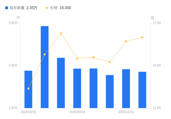 近一年(2025年2月28日至2026年2月28日),贵航股份A股股东户数从2.58万户,减低至2.35万户,降幅8.62%,区间股价上涨25.71%。