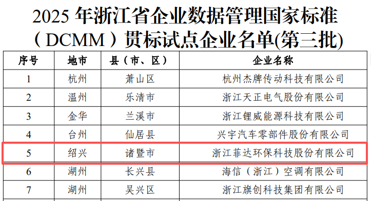 近日,浙江省经济和信息化厅公布2025年第三批企业数据管理国家标准(DCMM)贯标试点企业名单,菲达环保(600526)凭借在数据治理、信息化建设及产业数字化转型领域的多年建设经验成功入选。