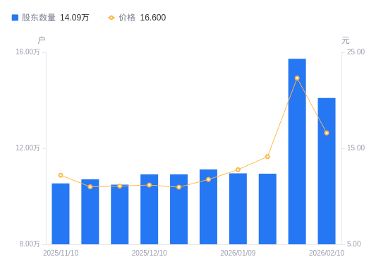 近一年(2025年2月20日至2026年2月10日),豫光金铅A股股东户数从6.79万户,增加至14.09万户,增幅107.55%,区间股价上涨157.16%。