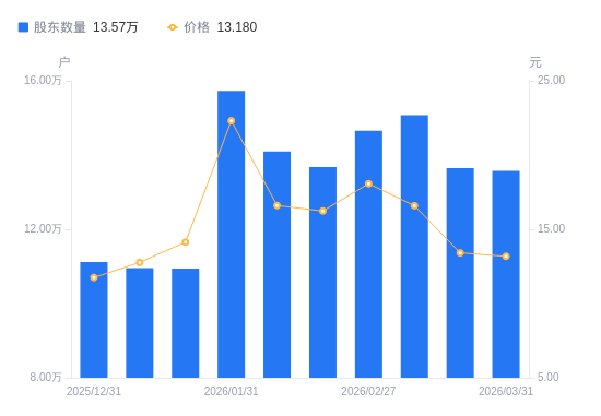 4月1日消息,数据显示,截至2026年3月31日,豫光金铅A股股东总户数为13.57万户,较上期(2026年3月20日)减少733户,降幅0.54%。公司最新A股总股本为12.09亿股,其中流通A股12.09亿股,户均持有流通A股数量为8910.77股,较上期增加47.87股,增幅0.54%;户均持流通A股市值11.74万元,较上期减少1407.52元,降幅1.18%。