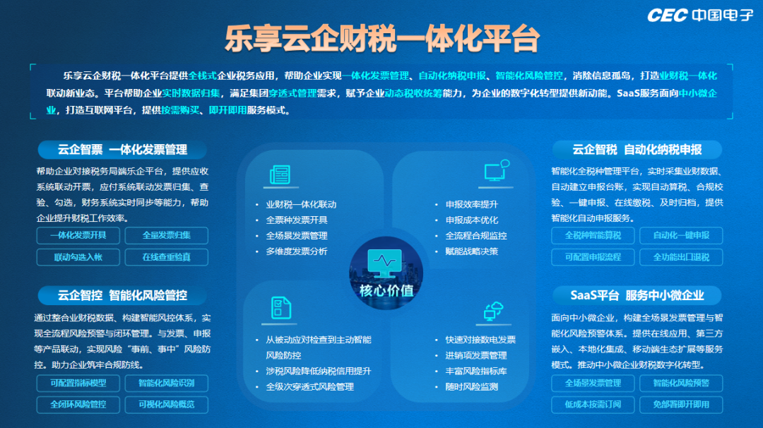 破局之道在于以数字化重塑财税治理体系,中国软件旗下中软云企打造的“乐享云企财税一体化平台”正是响应时代需求的典型实践。平台以“数智驱动”为核心,构建起覆盖企业经营治理需求的智慧财税底座。通过云原生架构,平台实现了财税数据的深度融合,打通销售、采购、人力、报销等内部系统壁垒,并通过标准接口无缝对接税务总局乐企平台,让企业经营行为能够实时生成规范、可用、可信的数据,从根本上夯实精准管理与合规治理基础。同时,平台将AI与流程自动化深度嵌入实际场景,大量重复性工作自动化处理,实现从票据识别、自动记账到申报与风控的全流程自动化,不仅显著提升效率,更释放财务人员的分析与决策价值。