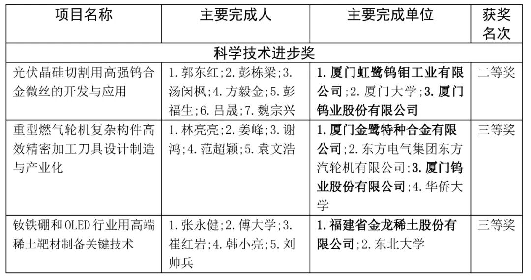 近日, 福建省人民政府印发《关于2024年度省科学技术奖励的决定》,对2024年度在科学技术进步活动中作出重要贡献的科学技术人员和组织给予奖励。经统计,厦门钨业(600549)及权属企业共有3个项目榜上有名,其中,获得科学技术进步奖二等奖1项、三等奖2项。具体名单如下: