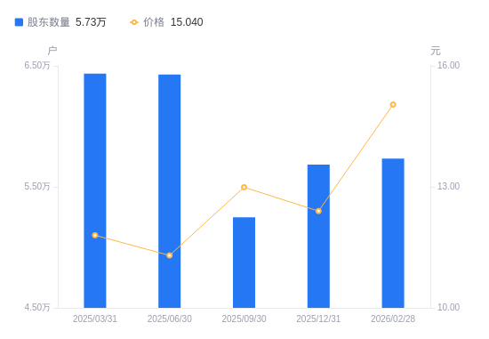 3月30日消息,数据显示,截至2025年12月31日,凯盛科技A股股东总户数为5.68万户,较上期(2025年9月30日)增加4348户,增幅8.28%。公司最新A股总股本为9.45亿股,其中流通A股9.45亿股,户均持有流通A股数量为1.66万股,较上期减少1376.96股,降幅7.65%;户均持流通A股市值20.61万元,较上期减少2.77万元,降幅11.85%。