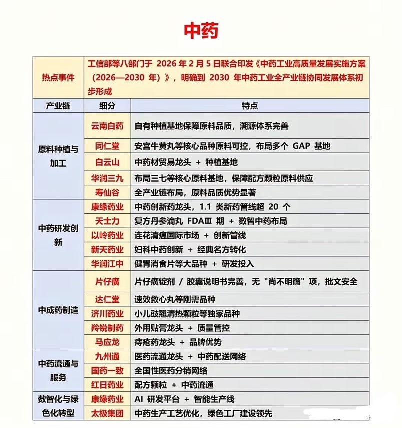 《中药工业高质量发展实施方案(2026—2030年)》的发布将显著利好A股中药产业链相关企业,特别是那些在原料资源、创新研发、制剂转化和数智化升级方面具备核心优势的上市公司。根据政策重点和行业分析,以下企业将获得实质性利好: