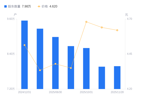 近一年(2024年12月31日至2025年11月28日),康恩贝A股股东户数从9.55万户,减低至7.98万户,降幅16.40%,区间股价上涨0.79%。