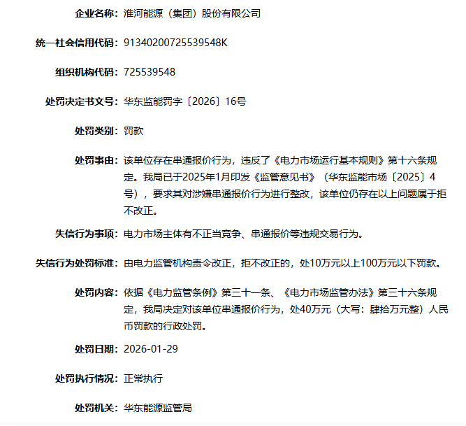 近日,国家能源局资质和信用信息系统处罚信息显示,淮河能源(600575)(集团)股份有限公司因存在串通报价行为,违反了《电力市场运行基本规则》第十六条规定,责令对涉嫌串通报价行为进行整改,但仍存在以上问题属拒不改正。被华东能源监管局罚款40万元。