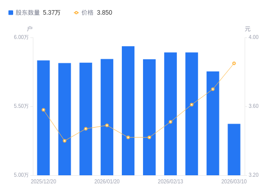近一年(2025年3月10日至2026年3月10日),淮河能源A股股东户数从4.76万户,增加至5.37万户,增幅12.88%,区间股价上涨22.22%。