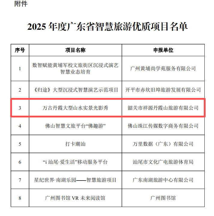 近日,广东省文化和旅游厅正式发布《关于公布2025年度广东省智慧旅游优质项目的通知》。由祥源文旅(600576)倾力打造的丹霞山“万古丹霞”大型山水实景光影秀项目,凭借突出的创新性与示范价值成功入选,成为韶关推动文旅数字化、智慧化转型升级的代表性项目之一,也彰显了祥源文旅在文旅融合与创新实践方面的积极成效。