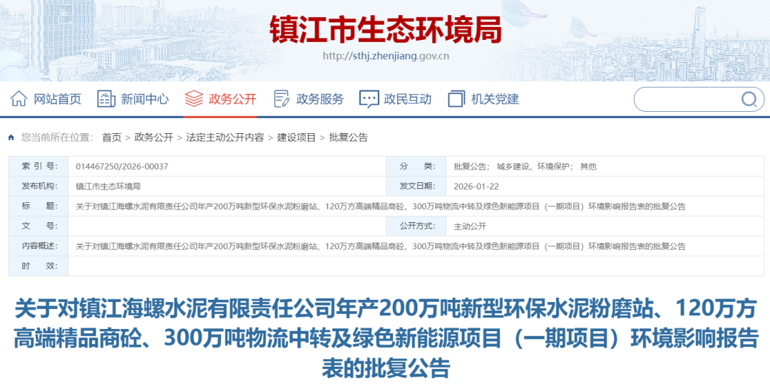 近日,江苏省镇江市生态环境局发布“关于对镇江海螺水泥有限责任公司年产200万吨新型环保水泥粉磨站、120万方高端精品商砼、300万吨物流中转及绿色新能源项目(一期项目)环境影响报告表的批复公告”。