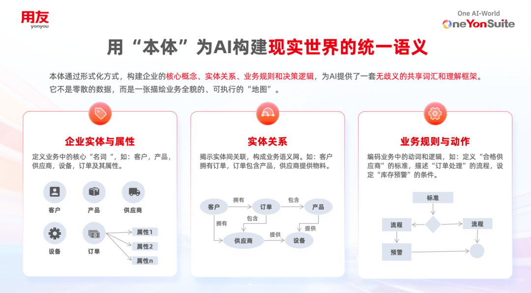 也正是在这样的背景下,企业对AI的热情是真实的,焦虑也是真实的。很多企业管理者都希望借助AI实现降本增效,但企业级AI的落地,从来不是简单接入一个大模型,更不是追逐一时热点,而是一项必须依托工程化体系、业务规则和平台能力来完成的系统工程。基于用友YonSuite的长期实践,我想谈谈对企业AI落地的一个核心判断:要真正跨越“最后一公里”,关键不在于让AI更会说,而在于让AI真正懂业务、守规则、能协同,而这背后的核心抓手,就是本体驱动的智能体(Ontology-driven Agent)。