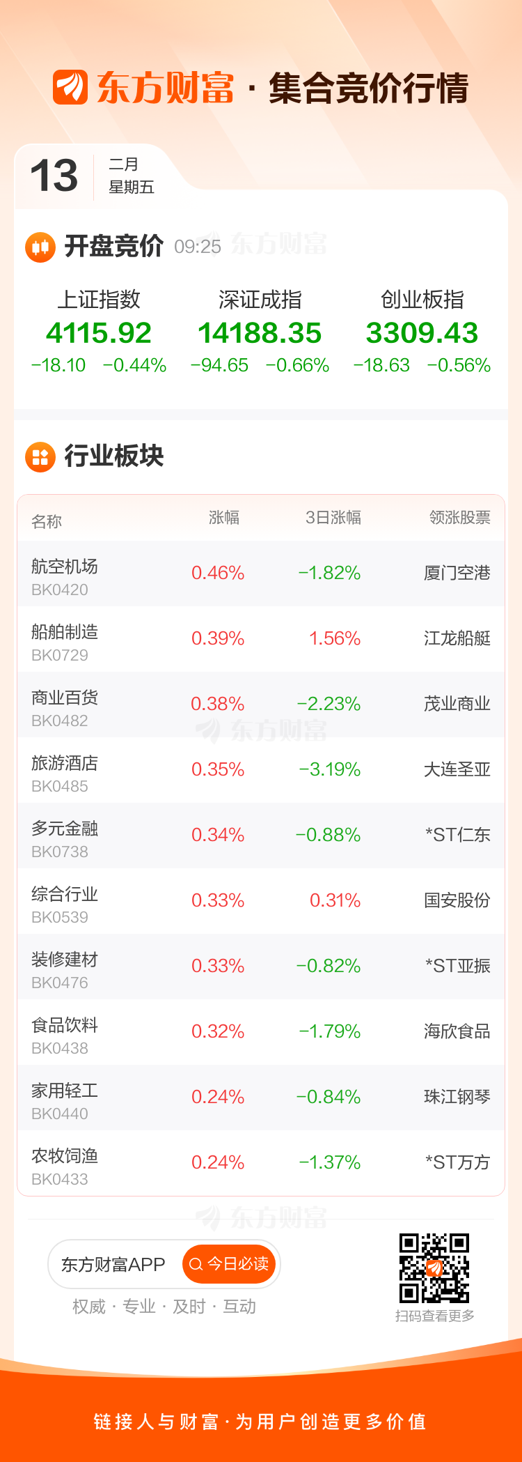 2月13日,三大指数集体低开,上证指数低开0.44%,深证成指低开0.66%,创业板指低开0.56%。板块方面,航空机场领涨,厦门空港涨1.78%,船舶制造、商业百货等开盘涨幅居前。