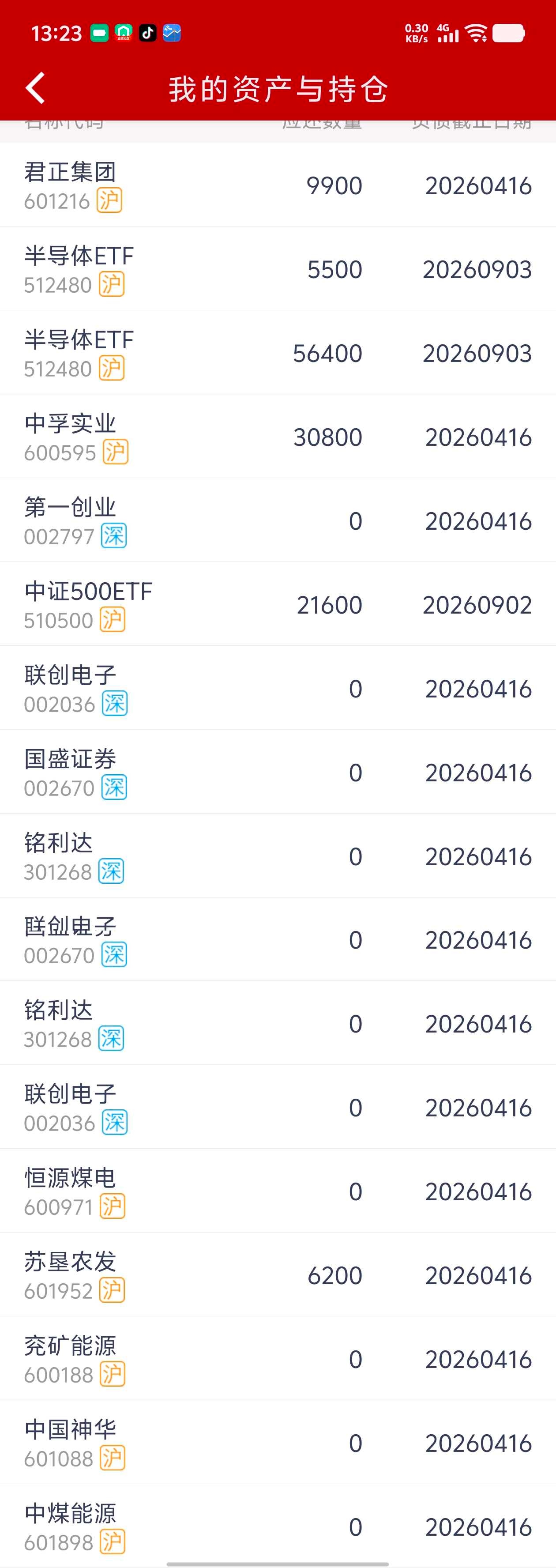 今日操作还是挺666的,开盘水下平了煤和券商,涨停板融券中孚实业,6.28建仓君正集团,1.580建仓半导体。浮盈近3.2w,合4.5%。唯有苏垦坚挺,我等着你补跌。
