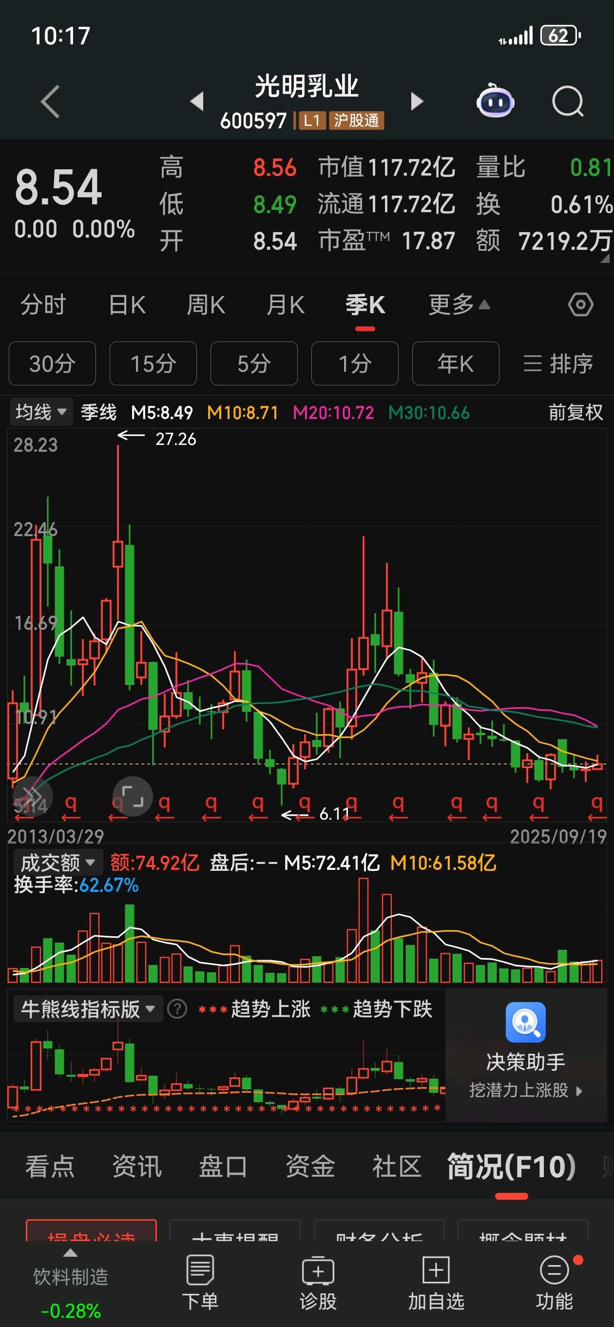 光明乳业从长期的机会看,已经具有购买的空间,就算是大跌向下,最多到4元左右。目前的估值不高,9元左右。
