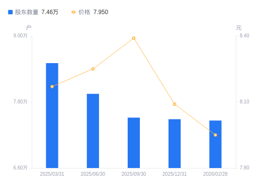 近一年(2024年12月31日至2025年12月31日),光明乳业A股股东户数从8.28万户,减低至7.49万户,降幅9.53%,区间股价下跌4.60%。