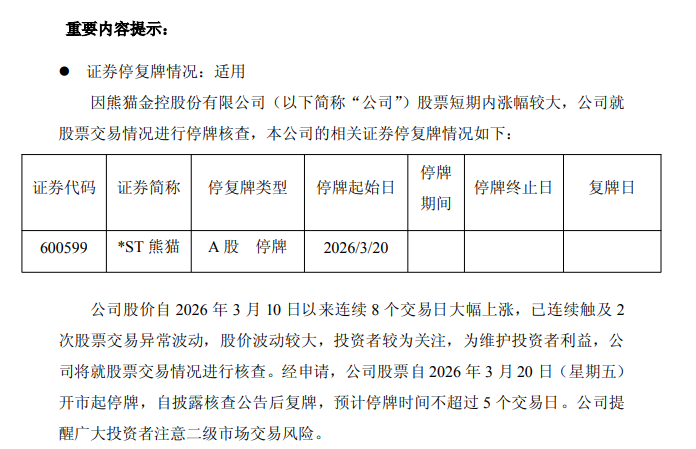 3月19日,*ST熊猫(600599)(600599.SH)公告,因公司股票短期内涨幅较大,公司就股票交易情况进行停牌核查。