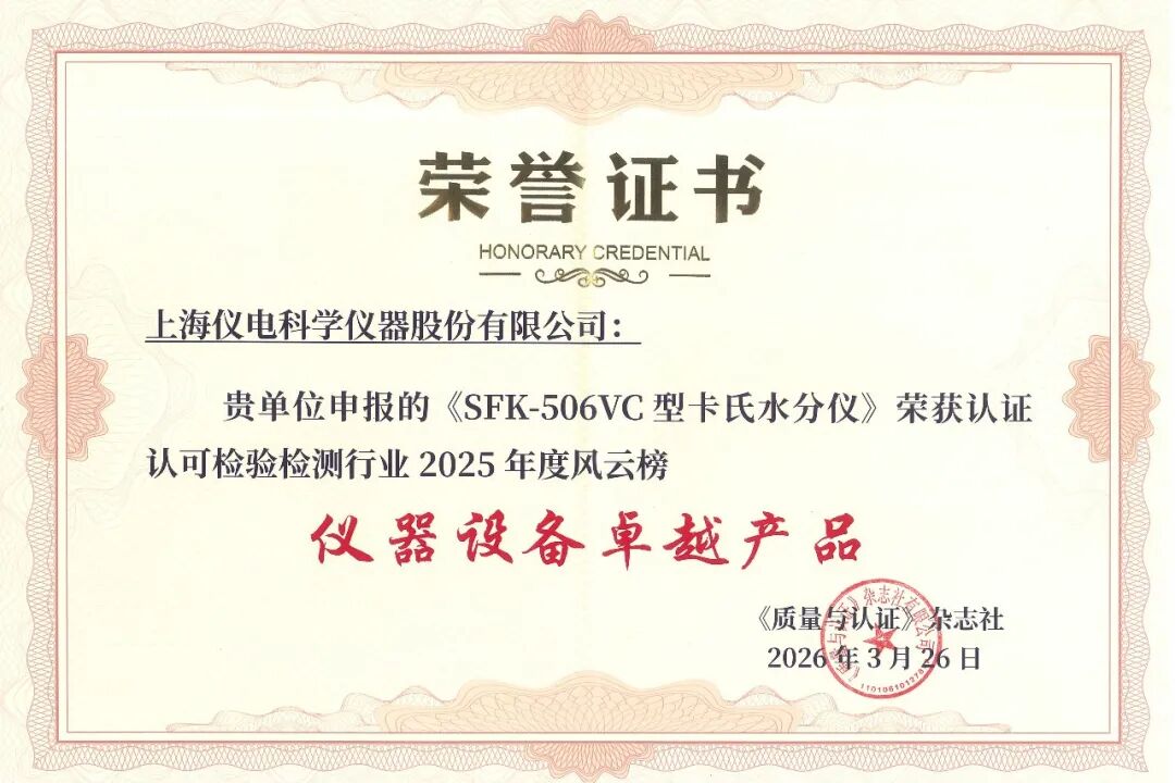 2026年3月26日,由《质量与认证》杂志社主办的2026认证认可检验检测行业高质量发展年会在北京隆重召开。云赛智联(600602)旗下企业上海仪电科学仪器股份有限公司凭借自主研发的雷磁SFK-506VC型卡氏水分仪荣获“认证认可检验检测行业2025年度风云榜·仪器设备卓越产品”奖项,彰显了企业在水分检测领域的持续技术积累与产品创新能力。