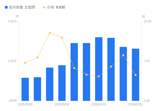 近一年(2025年3月31日至2026年3月31日),广汇物流A股股东户数从1.5万户,增加至2.32万户,增幅54.18%,区间股价下跌10.65%。