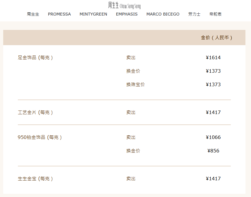 周生生报价1614元/克,周大福报价1618元/克,老凤祥报价1620元/克,老庙黄金报价1612元/克。
