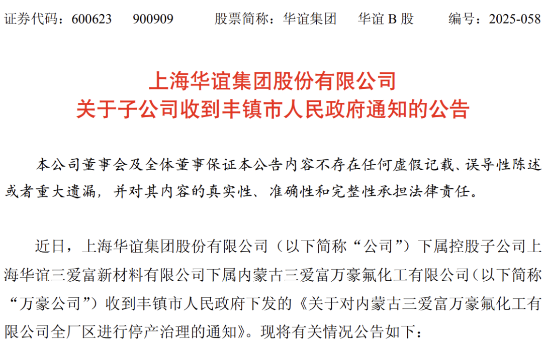 公告显示,华谊集团下属控股子公司上海华谊三爱富新材料有限公司下属内蒙古三爱富万豪氟化工有限公司(以下简称“万豪公司”)收到丰镇市人民政府下发的《关于对内蒙古三爱富万豪氟化工有限公司全厂区进行停产治理的通知》。按照公告,为切实消除风险隐患、保障生态环境质量,丰镇市人民政府决定对万豪公司全厂区进行停产治理。