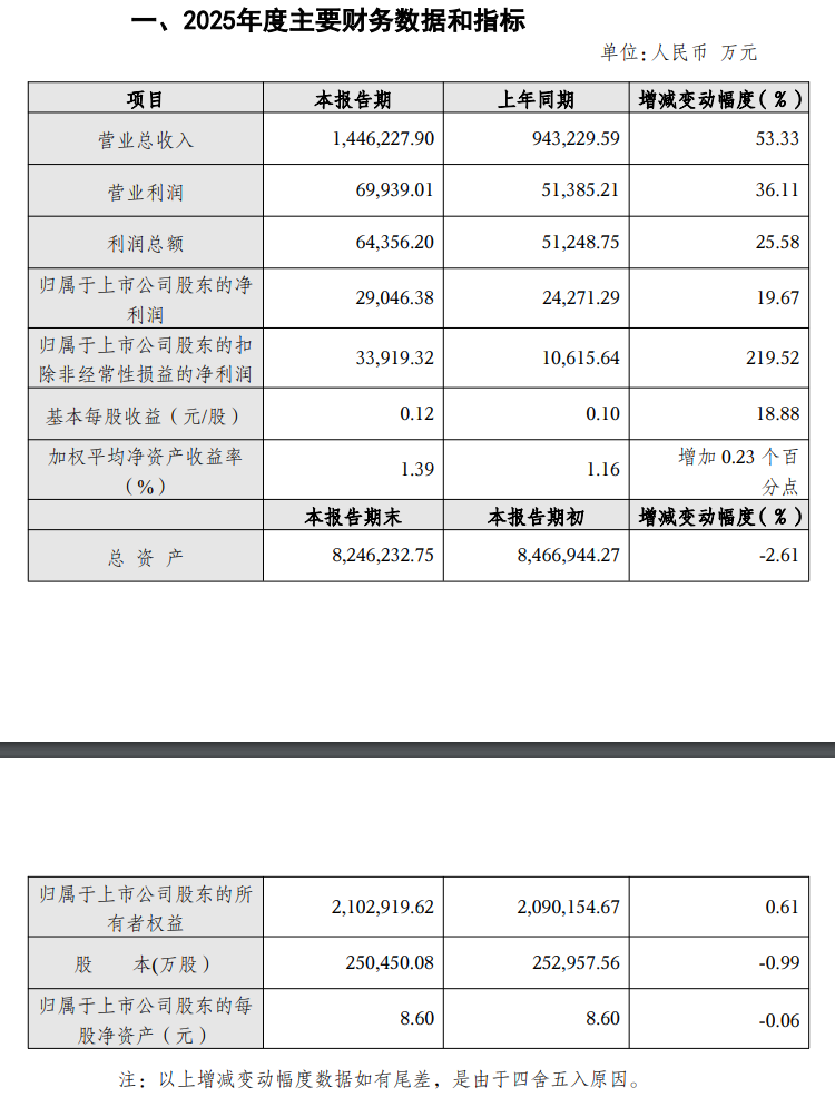 2月9日,城投控股(600649)(600649.SH)披露2025年年度业绩快报,全年营业总收入144.62亿元,上年同期94.32亿元,同比增长53.33%;利润总额6.44亿元,上年同期5.12亿元,同比增长25.58%;归属于上市公司股东的净利润2.90亿元,上年同期2.43亿元,同比增长19.67%;归属于上市公司股东的扣除非经常性损益的净利润3.39亿元,上年同期1.06亿元,同比增长219.52%;基本每股收益0.12元,上年同期0.10元,同比增长18.88%。